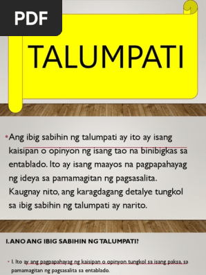TALUMPATI Layunin nitong mapapanig ang mga tagapakinig sa ideyang ideyang inilalahad o pinaniniwalaan ng mananalumpati. Lahat tayo ay abala sa kanya kanyang laban sa buhay. Pagsasalin sa konteksto ng TALUMPATI SA HARAP sa tagalog-ingles.