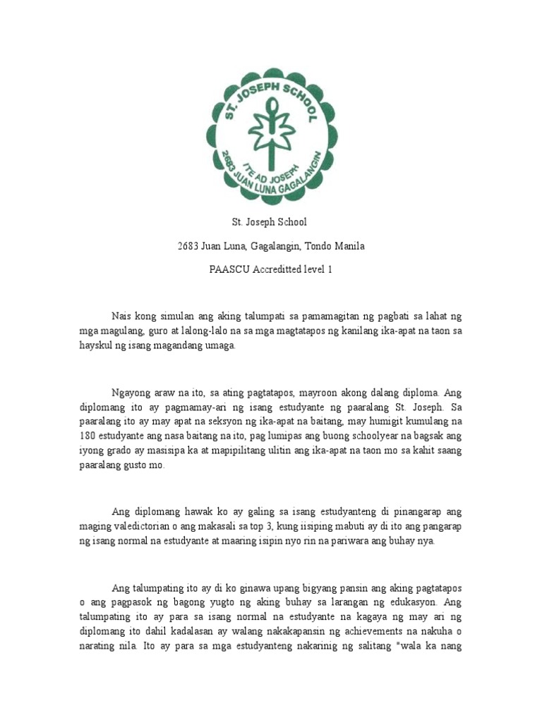 Gayunman kapag mas nanaig sa iyo ang kagustuhang matapos ang lahat ng ito tiyak na hindi panghabambuhay ang paghihirap na matatamasa mo at ng iyong pamilya. Tunay ngang ang araw na ito ay nakagagalak na pagdiriwang hindi lamang dahil sa pagtatapos ng isa na namang taon ng kaalaman at pagkatuto ng pagsisikap at pagtitiyaga ng ating mga mag-aaral. All the papers are written Talumpati Tungkol Sa Graduation Speech from scratch.