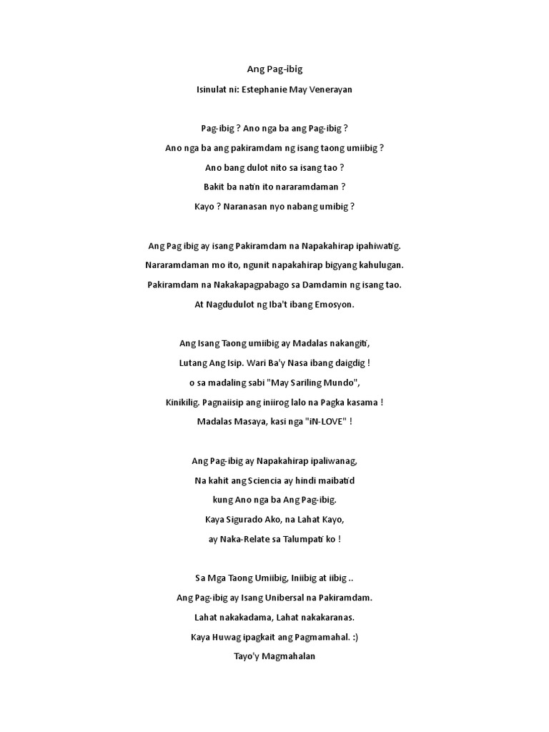 Ang pag ibig talumpati ni estephanie may venerayan. Kung Ano nga ba Ang Pag-ibig. Sana ang pag-ibig na ipinadarama natin ay higit pa sa salitang pag-ibig na binibigkas lamang ng ating mga bibig. Sa talumpating ito sinasaad ng Estephanie May Venerayan na ang pagmamahal ay isang pakiramdam na mahirap ipahiwatig.