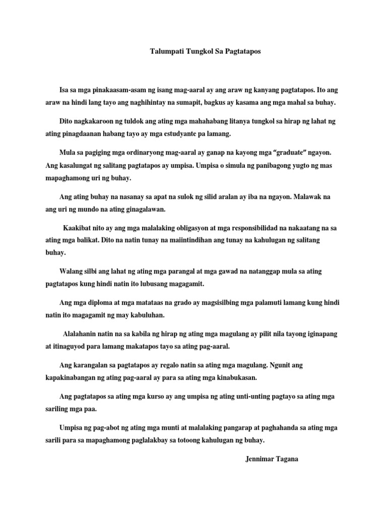 Pagtatapos taglay ang mga salitang iyon sa huling pahina jw 2017 12filipino mga talumpati ang pagtatalumpati october 12th 2018 - isinaulong talumpati รข. Handa sa Hamon nang Buhay para sa k-12 graduates part. Talumpati Tungkol Sa Pagtatapos.