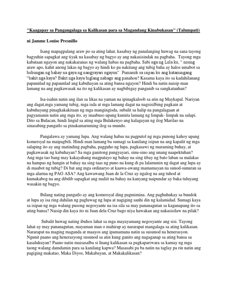 Talumpati Tungkol sa Kalikasan Mula sa TakdangAralinph Narito. Maaaring gas-gasan na ang mga katagang huwag magtapon ng basura kung saan-saan ngunit ito sana. Ngunit ang mas nakababahala ay ang.
