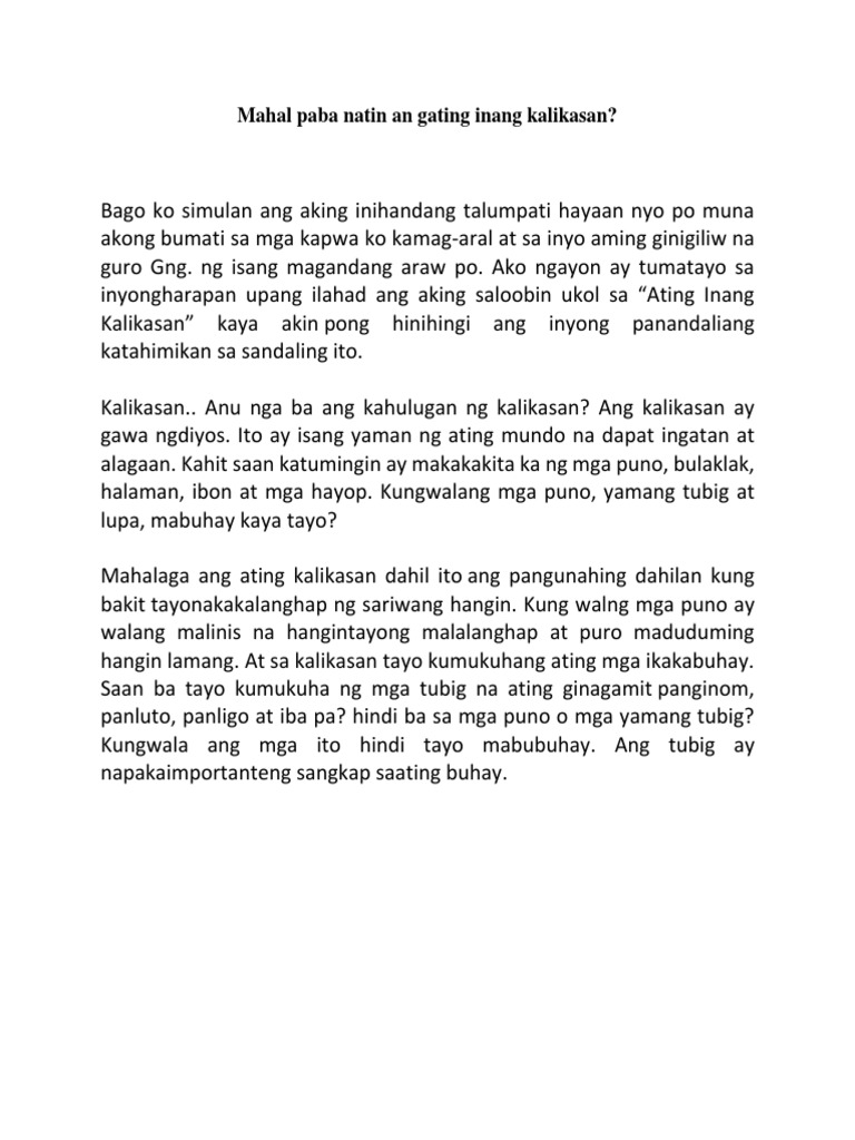 Narito ako ngayon upang talakayin ang mga hindi nawawalang isyu na tungkol sa kalikasan. Talumpati tungkol sa kalikasan tagalog ni Jeric B. Talumpati Tungkol Sa Kalikasan maikling talumpati tungkol sa kalikasan tagalogNarito ako ngayon upang talakayin ang mga hindi nawawalang isyu na tungkol sa kalikasan.