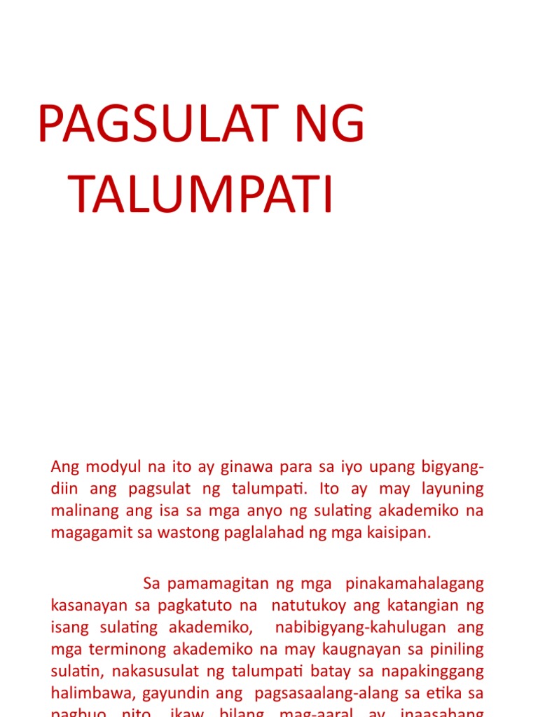 Ngayon na nalaman na natin kung ano ang kahulugan at uri ng talumpati ayon sa layunin talakayin naman natin ang mga uri ng talumpati ayon sa pamamaraan. TALUMPATI Ang modyul na ito ay ginawa para sa iyo upang bigyang-diin ang pagsulat ng talumpati. Magturo Layunin ito ng pagtatalumpati na ibigay ang wasto at nararapat na konsepto o kaisipan ukol sa isang paksa o pagbibigay ng wastong paraan upang makabuo ng isang bagay.