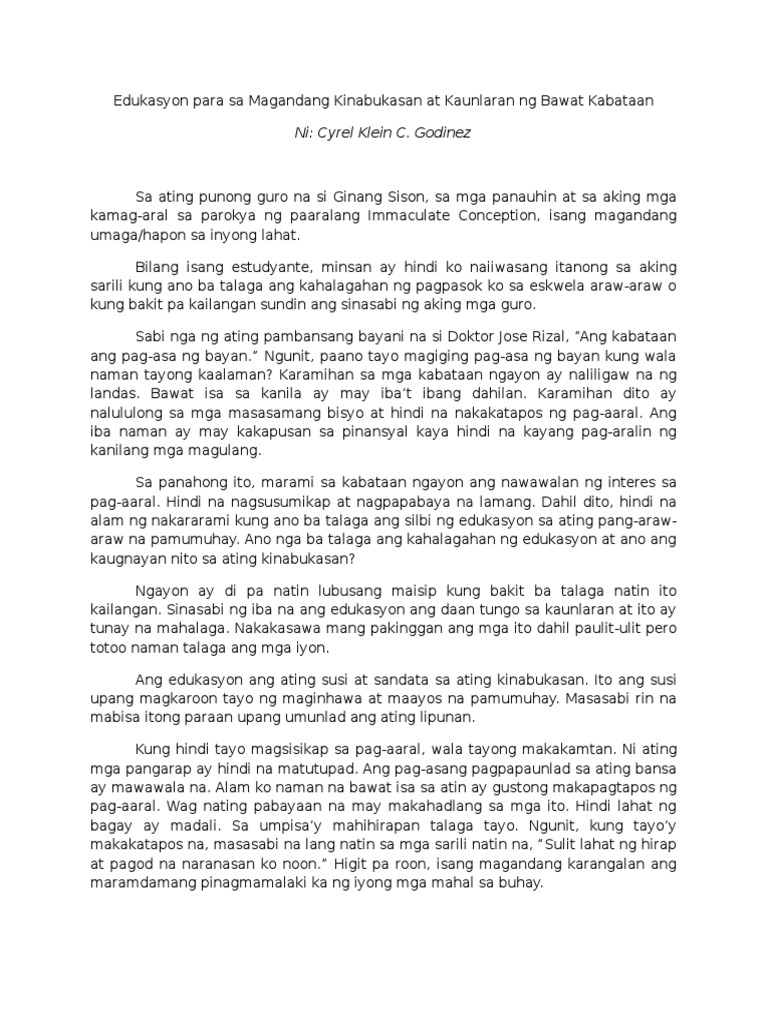 Ang pagkakaroon natin ng sapat na. Edukasyon Talumpati Edukasyon ay di mananakaw ninuman kultura ang kinapapalooban ng mga paniniwalat kaugalian palakasan. A short summary of this paper.