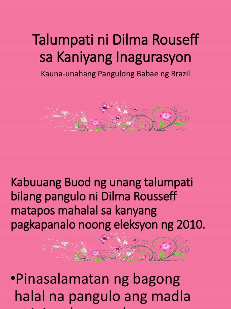 Chưa có sản phẩm trong giỏ hàng. Siya ay nasisilbi bilang ika-36 Pangulo ng BrazilSiya ang unang babae sa puwesto. PAGLALAHAD NG ARALIN Sipi mula sa Talumpati ni Dilma Rousseff sa Kaniyang Inagurasyon Kauna-unahang Pangulong Babae ng Brazil Enero 1 2001 Isinalin sa Filipino ni.