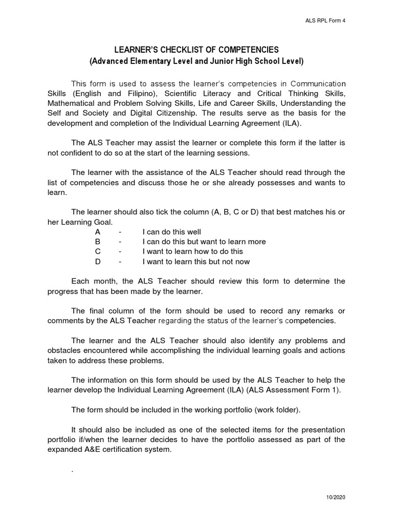 Als Rpl Form 4 Learner S Checklist Of Competencies For Advanced Elementary Level Junior High School Level Pdf Verb Adverb