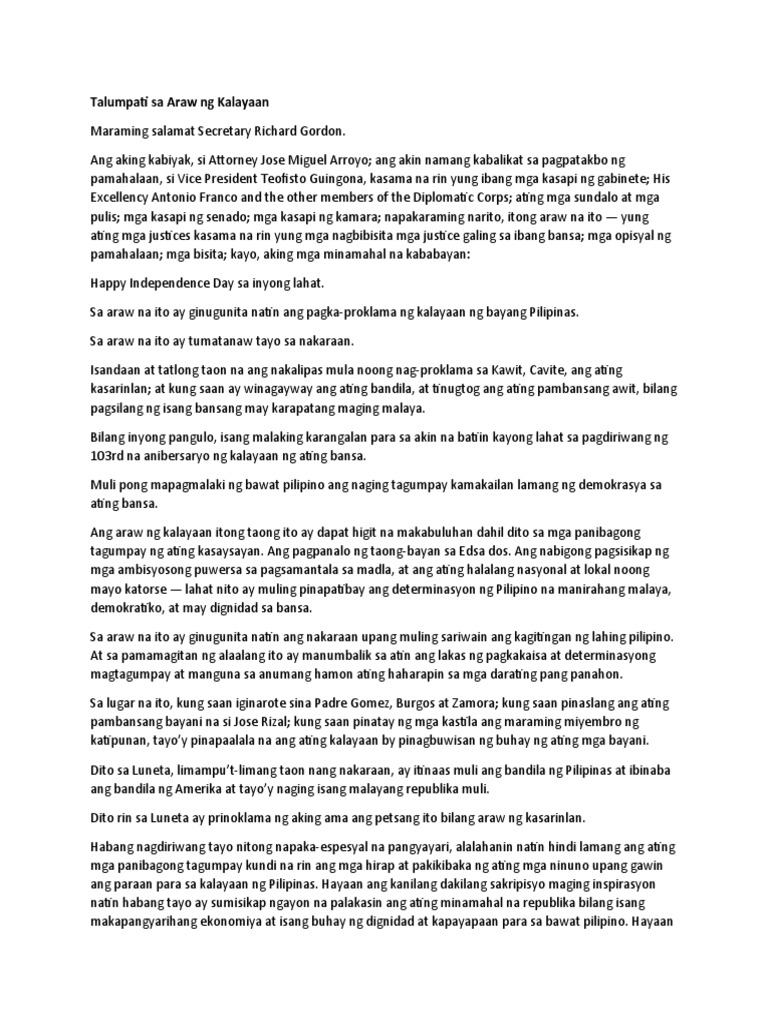 Ganito rin ang kahalagahan ng kalayaan para sa isang bansa. 0 0 found this document useful Mark this document as useful. Aquino III Pangulo ng Pilipinas Sa pagdiriwang ng anibersaryo ng Araw ng Kalayaan Inihayag sa Liwasang Bonifacio Maynila.